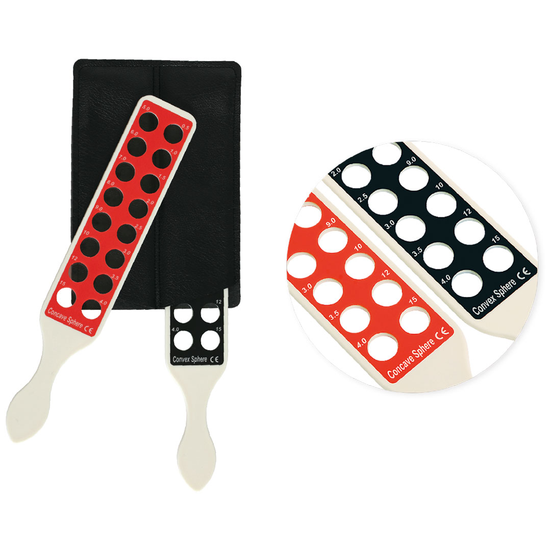Deux barres de rétinoscopie de haute qualité sont incluses : un porte-lentilles rouge pour les lentilles négatives et un porte-lentilles noir pour les lentilles positives. Chaque porte-lentilles contient 16 lentilles avec les puissances suivantes :